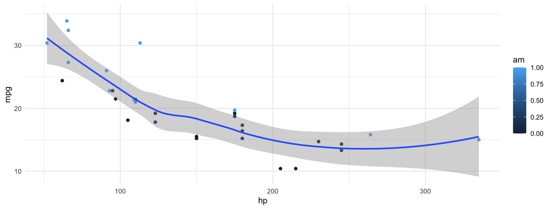 ggplot(mtcars, aes(hp, mpg, color = am)) +