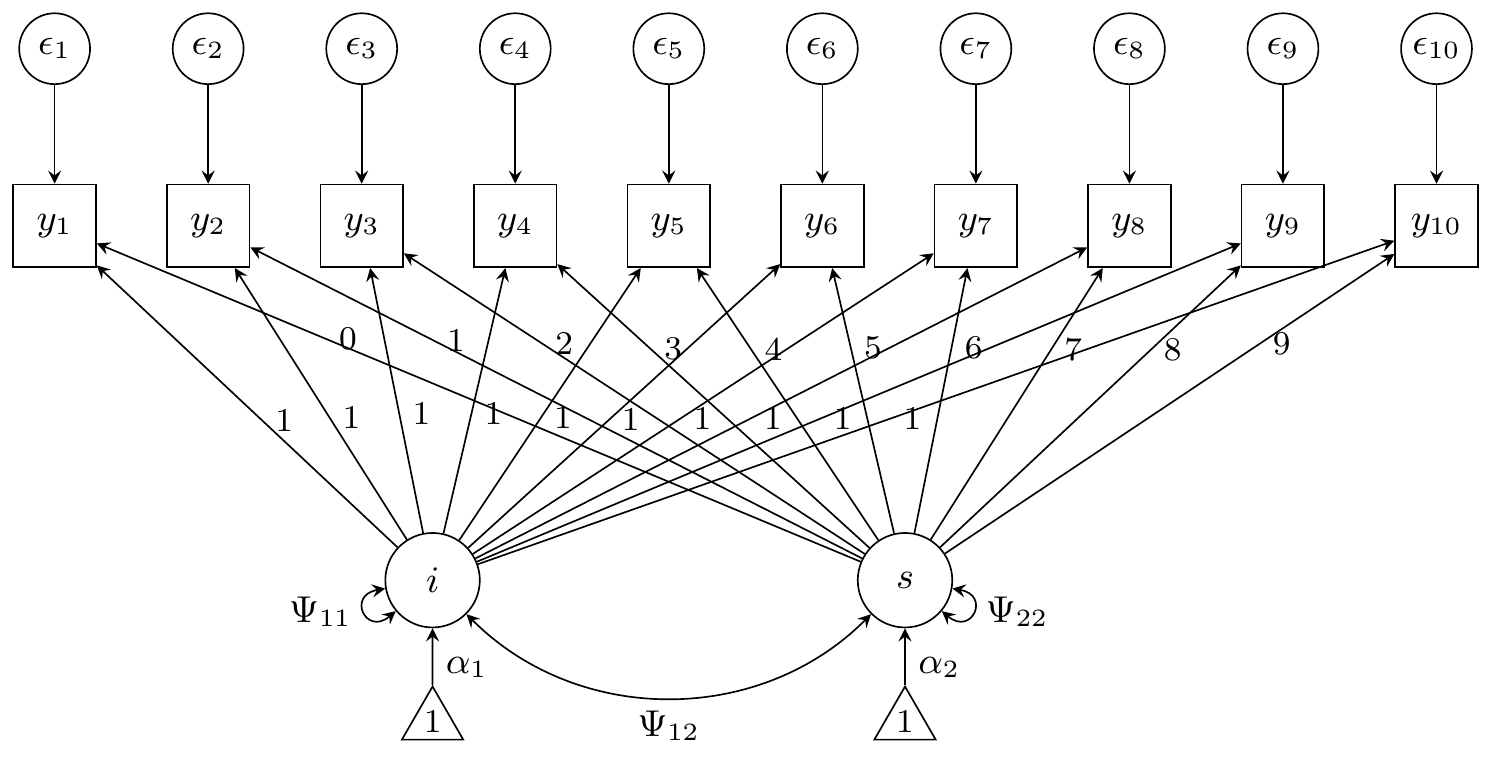 For the growth curve model, we have a latent intercept and slope (so ). There are five parameters in the latent component: Two intercepts and , and the three unique variances and covariances , , and . The loadings for the “intercept” latent variable are all fixed to 1, whereas the loadings for the “slope” latent variable increment from 0 to 9. Thus, is some fixed matrix. Furthermore, the observed variables , share a common residual error variance . In total, there are six parameters to be estimated in the model (in this order): .