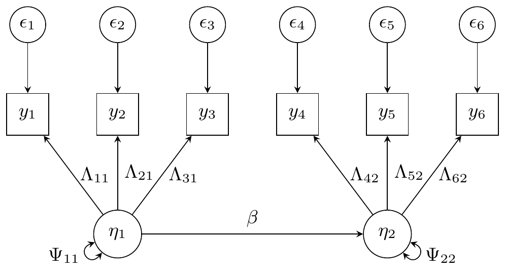 For the two factor model, we have two latent variables and , each indicated by three observed variables, and respectively. Each observed variable has a corresponding error , leading to six variance parameters. The latent variables have a regression path from to with parameter , and each have a variance parameter and respectively. For the factor loadings, we fix and to for identifiability. The thirteen parameters to be estimated in the two factor model are . (In this order in the code).