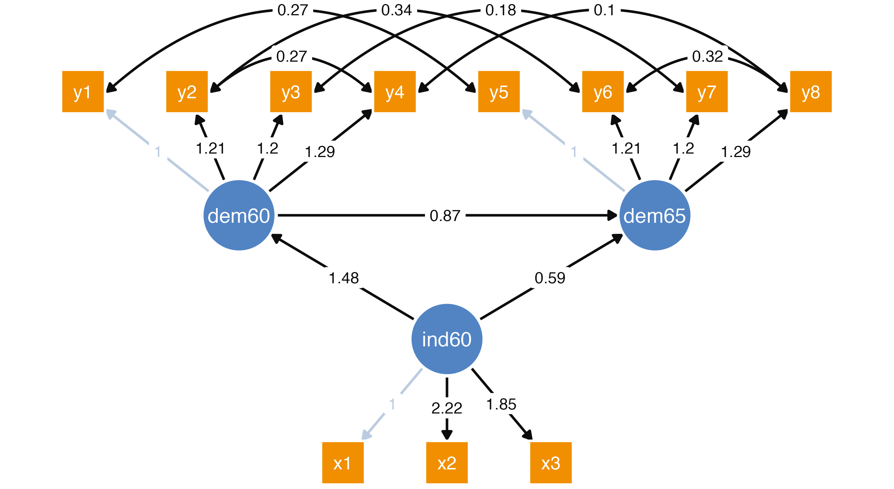 ind60 0.823 0.260 0.325 1.346 0.001 normal(0,10)