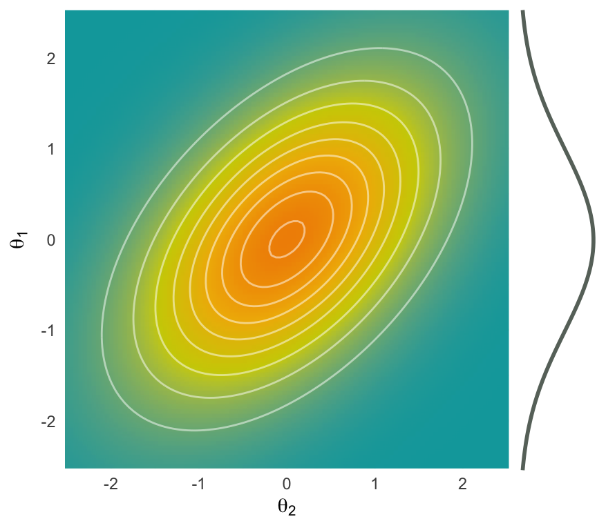 \[ \small \begin{gathered} f(\vartheta_1, \vartheta_2) = \N(\vartheta_2 \mid 0, e^{\vartheta_1}) \, \N(\vartheta_1 \mid 0, 1) \\ \vartheta^* = (-0.5, 0)^\top, \Sigma_\vartheta = \operatorname{diag}(1, e^{0.5}) \\ \end{gathered} \]