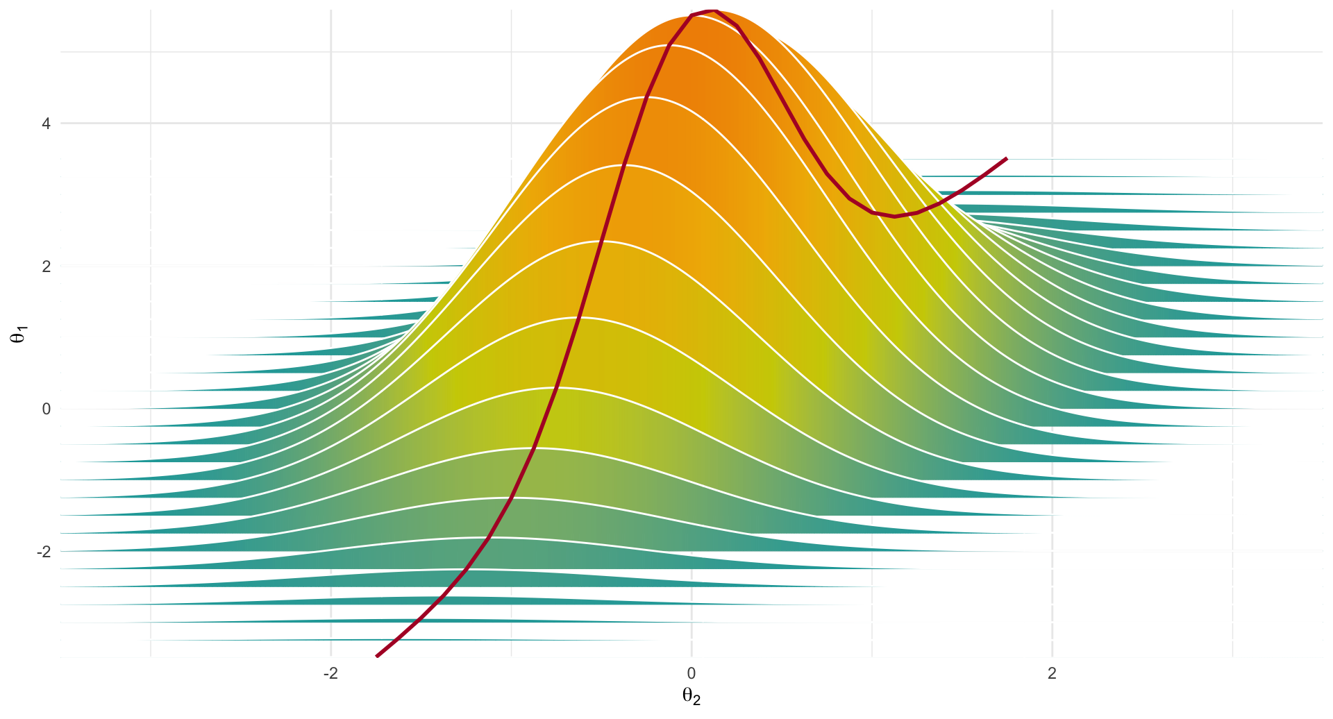 The set \(\mathcal{C}_j = \big\{ \vartheta \in \mathbb{R}^m \mid \vartheta_{-j} = \operatorname{E}_{{\pi_G}}[\vartheta_{-j} \mid \vartheta_j] \big\}\) is the sufficient integration path for the marginal, i.e. \(\pi(\vartheta_j) \propto \pi(\vartheta)\big|_{\vartheta\in\mathcal C_j}\).