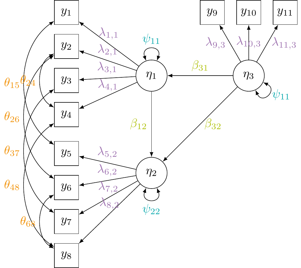 Let \(y_s \in \mathbb R^p\) be obs. vector. For \(s=1,\dots,n\), \[ \definecolor{kaustorg}{RGB}{241, 143, 0} \definecolor{kausttur}{RGB}{0, 166, 170} \definecolor{kaustmer}{RGB}{177, 15, 46} \definecolor{kaustgrn}{RGB}{173, 191, 4} \definecolor{kaustblu}{RGB}{82, 132, 196} \definecolor{kaustpur}{RGB}{156, 111, 174} \begin{gathered} y_s = {\color{Gray}\nu +\,} {\color{kaustpur}\Lambda} \eta_s + \epsilon_s \\ \eta_s = {\color{Gray}\alpha +\,} {\color{kaustgrn} B} \eta + \zeta_s \end{gathered} \]
