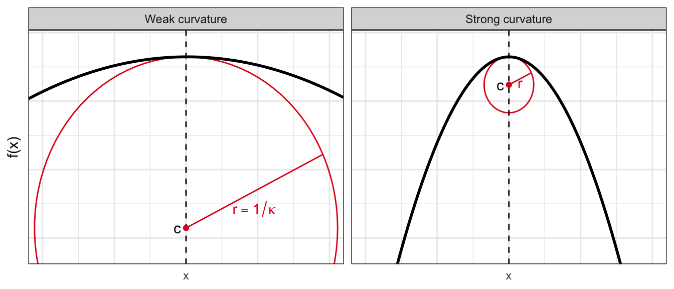 Let \(\mathcal C_x\) denote the osculating circle at \(x\) with centre \(c\) and radius \(r\), i.e. the circle that best approximates the graph of \(f\) at \(x\). Historically, the curvature \(\kappa\) for a graph of a function \(f\) at a point \(x\) is measured as \(\kappa = \frac{1}{r}\).