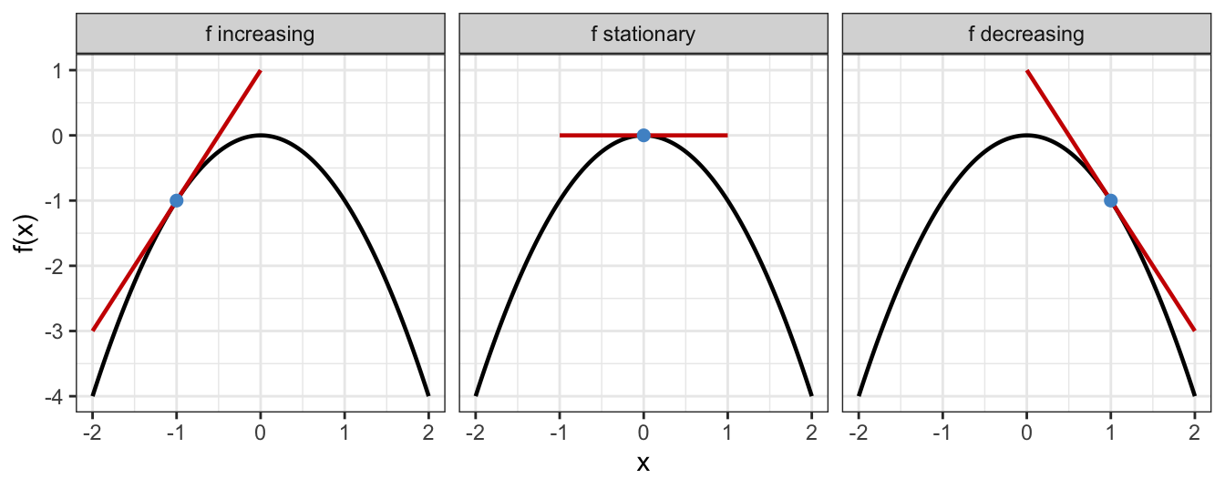 Derivatives represent rate of change (slope) of a function \(f:\mathcal X \to \mathbb R\).