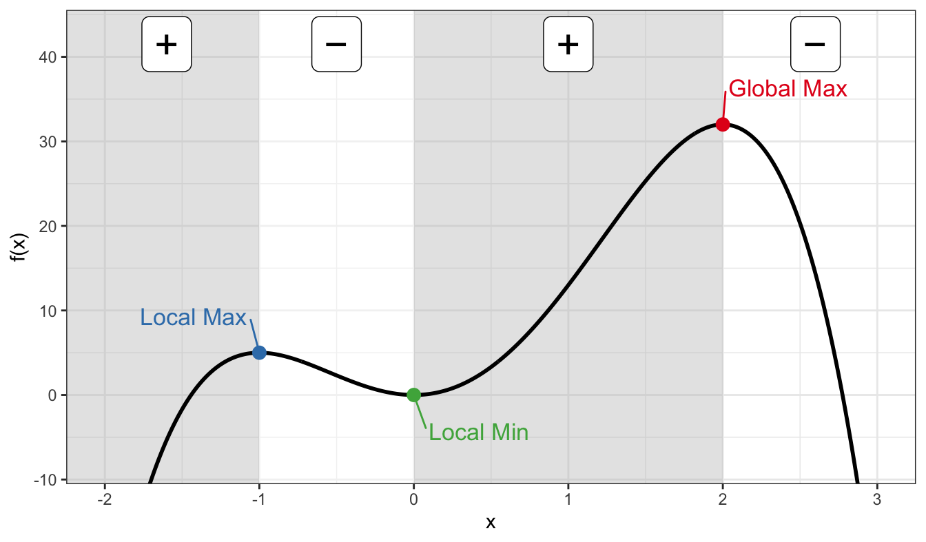 Second derivative test: Measure the change in slope around a point \(x\), i.e. \(f''(\hat x) = \frac{d}{dx}\left( \frac{df}{dx}(x) \right) = \frac{d^2f}{dx^2}(x)\).