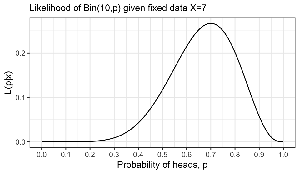 Naturally, you go ahead and collect data by tossing it \(n=10\) times. The outcome happens to be \[ H, H, H, T, T, H, H, T, H, H \] There is a total of \(X=7\) heads, and from this you surmise that (at least) the coin is unlikely to be fair, because: